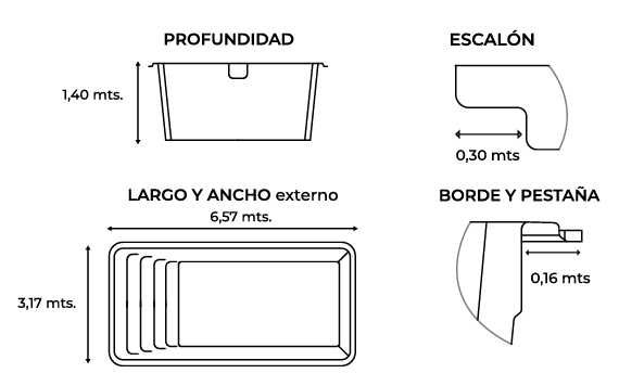 Largo y Ancho: 6,57 mts. X 3,17 mts.Volumen total (al ras): 20502 ltsProfundidad: 1,4 mts.Moldura Skimmer: 3 Mold. retornos